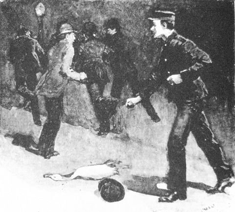 His remarks were suddenly cut short by a loud hubbub which broke out from the stall which we had just left. Turning round we saw a little rat-faced fellow standing in the centre of the circle of yellow light which was thrown by the swinging lamp, while Breckinridge, the salesman, framed in the door of his stall, was shaking his fists fiercely at the cringing figure.