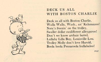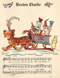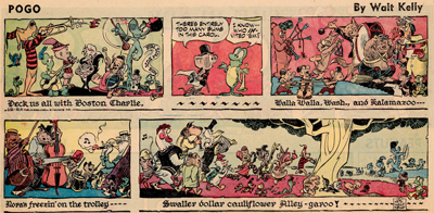 It should come as no surprise that my favorite comic strip is Walt KellyTMs Pogo. A lot of comics have their Christmas traditions, but in my mind itTMs Pogo that is most closely associated with Christmas because every year Kelly did some variation of his parody of “Deck The Halls With Boughs of Holly.” In the unique Pogo-ese spoken by the swamp critters, it came out as “Deck Us All With Boston Charlie.”